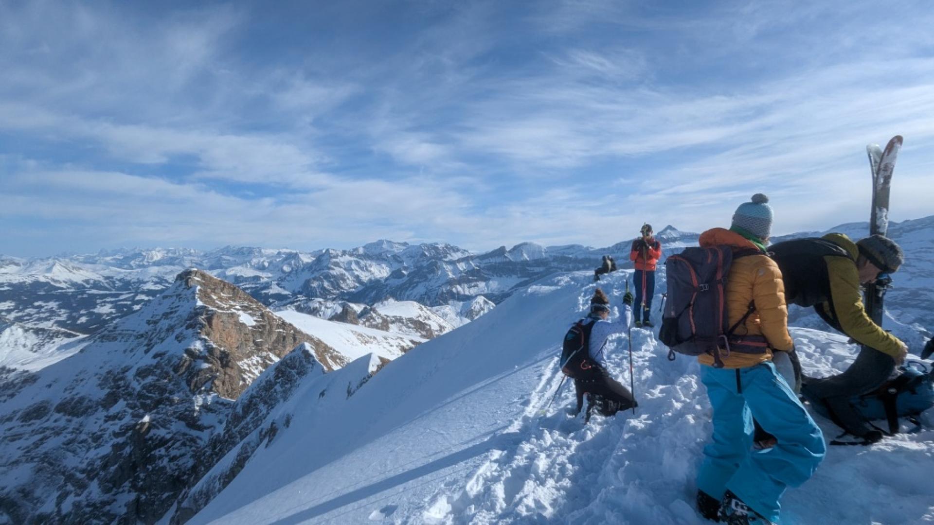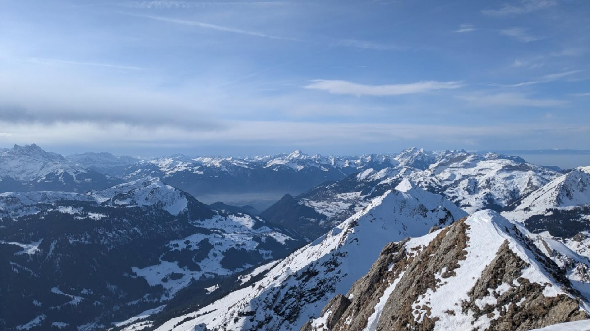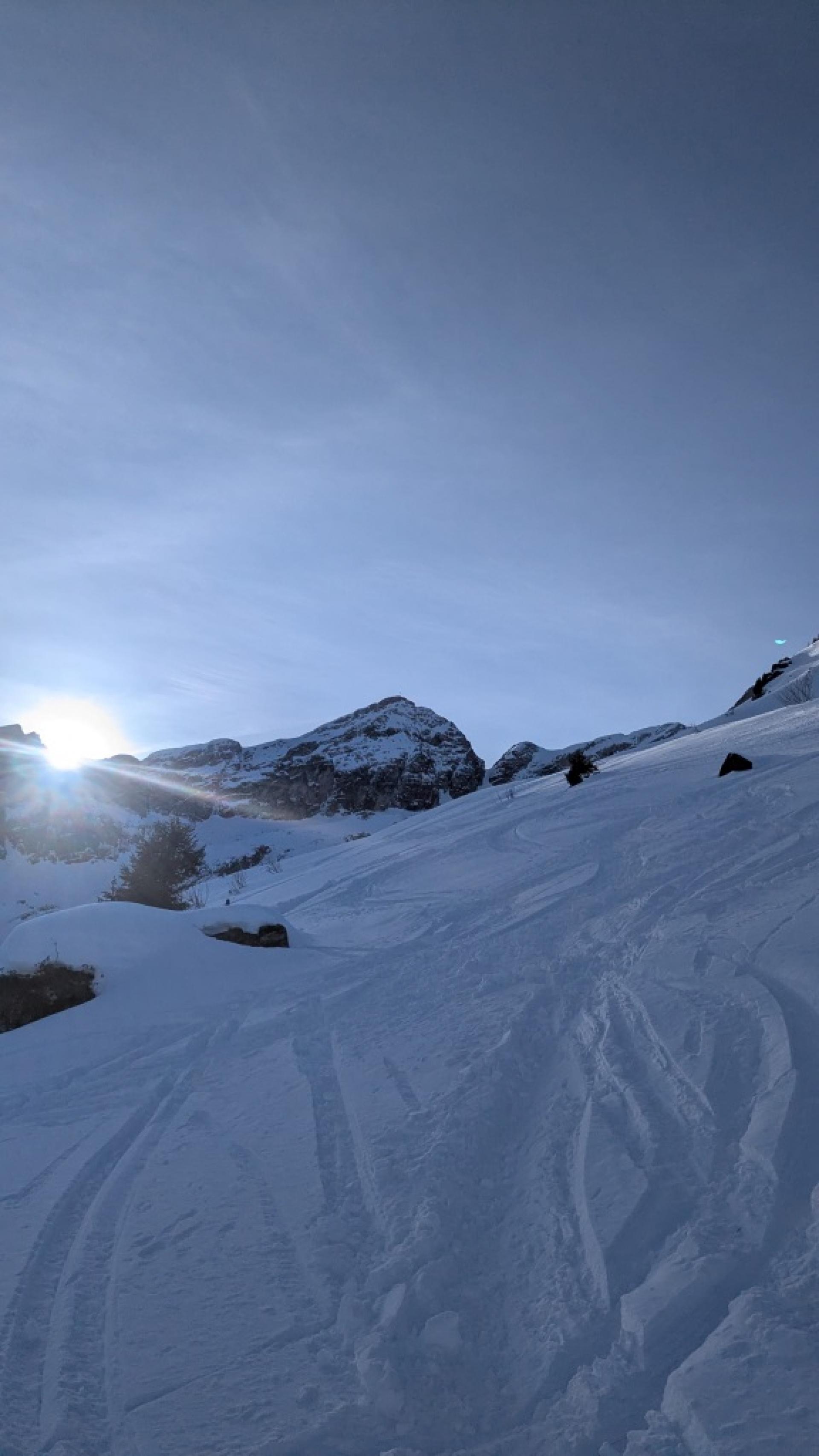 Le Tarent (2548m)Après une bonne nuit réparatrice (pour moi en tout cas!) et un bon petit déj à l’hôtel de la gare de Montbovon, on récupère Kilian qui arrive en train, sur le quai de la gare en face de l’hôtel à 8h20 pétantes (vive la ponctualité suisse!). Direction L’Etivaz pour faire découvrir aux « p’tits jeunes » le Tarent (malgré leur appréhension face au BRA à 3- et les derniers 100 m qui restent en rouge sur skitourenguru). Démarrage vers 9h, on longe la route jusqu’au petit barrage puis c’est parti pour l’atelier apprentissage des conversions en neige un peu dure et gelée dans la grande pente sous le Lévanchy. Kilian s’en sort bien mais y laisse quelques forces et quelques zipettes. C’est plus cool après le petit raidillon dans les vernes. On prend un petit rythme de croisière jusqu’à la traversée qui nous amène à la combe finale du Tarent. La neige est pas mal travaillée et soufflée par endroit. La trace est pas mal gelée donc faut faire gaffe à pas glisser. Pas besoin de mettre les couteaux non plus mais ça impressionne un peu Kilian qui avance doucement dans certaines traversées en neige dures. Arrivant à 2100 m, il décide de s’arrêter là, plus trop de jus pour poursuivre. Alexis propose de rester avec lui pendant que je vais vite faire le sommet. C’est donc parti pour les 400 m derniers mètres en mode rapide. Je rattrape quelques groupes et termine la montée ski sur le sac pour la petite pente sommitale et l’arête. Une dizaine de personnes au sommet qui pique nique en prenant le soleil. Je ne traîne pas et attaque dès le haut la descente ski au pied (aucun intérêt, c’est tout du dérapage sur la crête dans une neige dégueulasse pleine de caillasse). Le haut de la combe est en vieille poudreuse déjà très tracée. 200 m plus bas, c’est très travaillée voire croûtée donc pas évident à trouver la bonne orientation pour avoir de la bonne neige mais j’arrive à y prendre plaisir. Je retrouve Alexis et Kilian qui finissent de manger. Les champs entre 2000 m et 1700 m offrent une belle petite poudreuse encore agréable à skier. Par contre, en dessous, c’est déjà en train de regeler et ça devient croûté et difficilement skiable. Mes deux compères préfèrent faire le détour par la route pour éviter la partie dégueulasse dans les vernes. Je les attend en dessous puis retour au parking par le chemin encore bien enneigé.