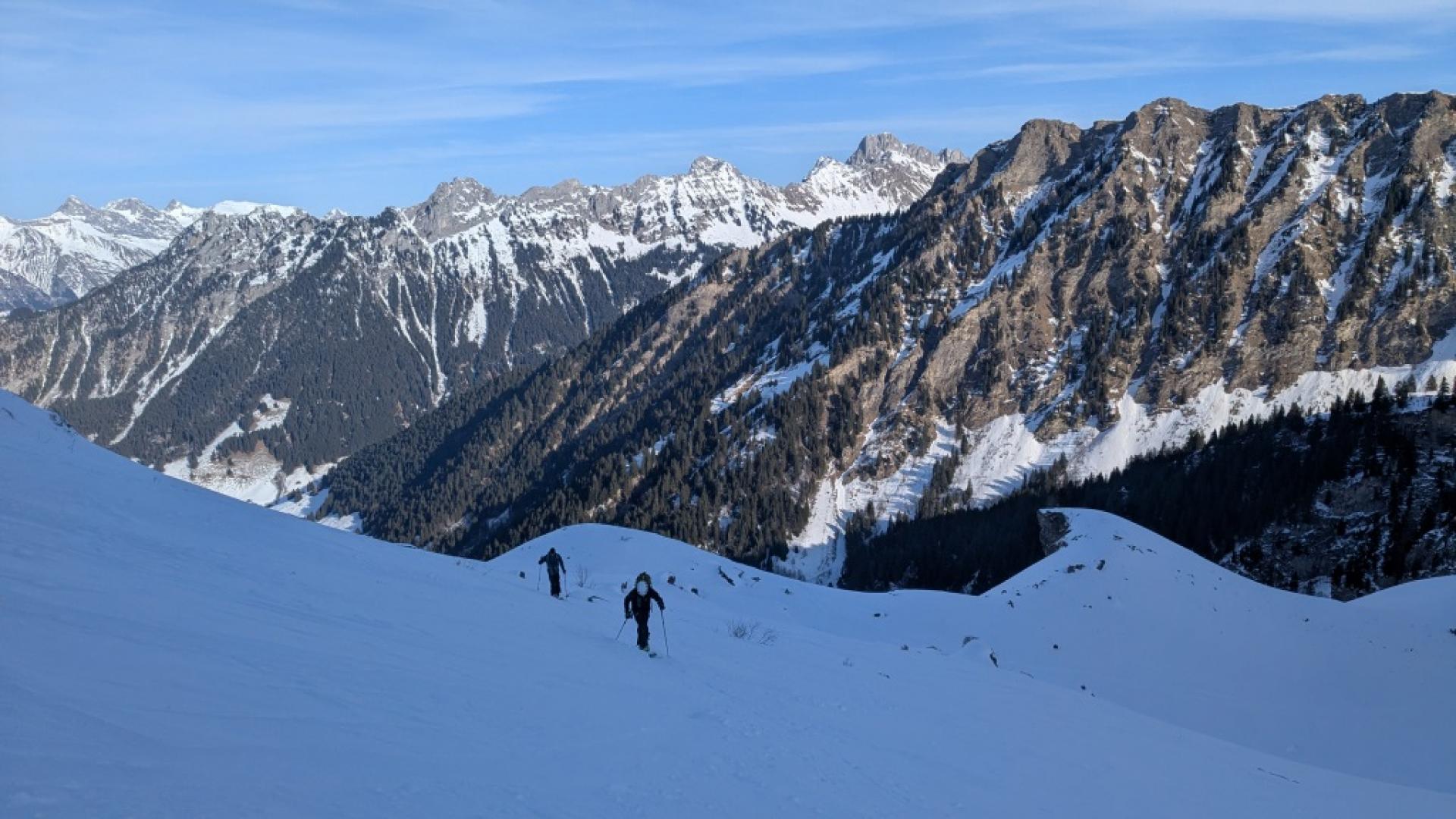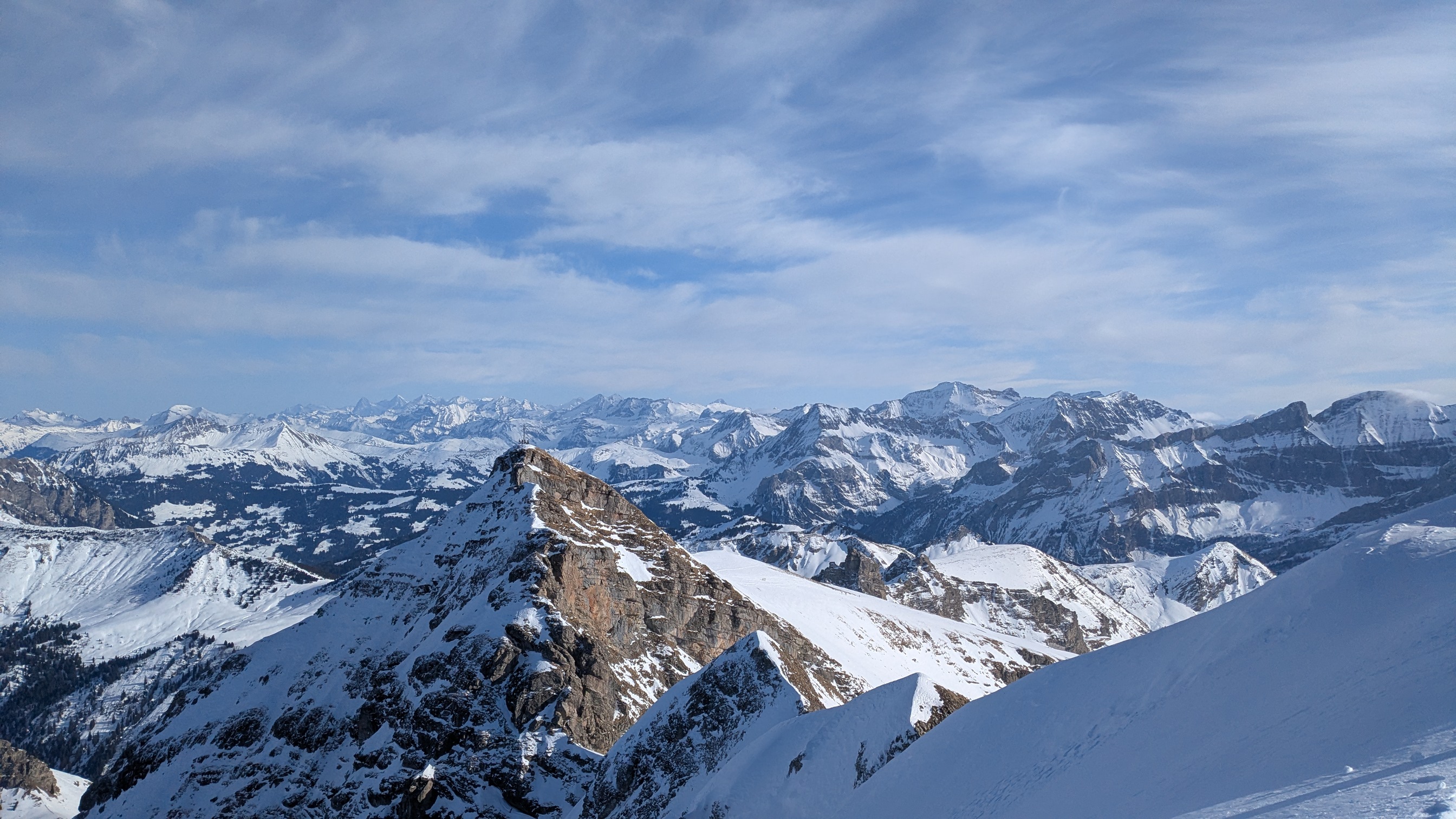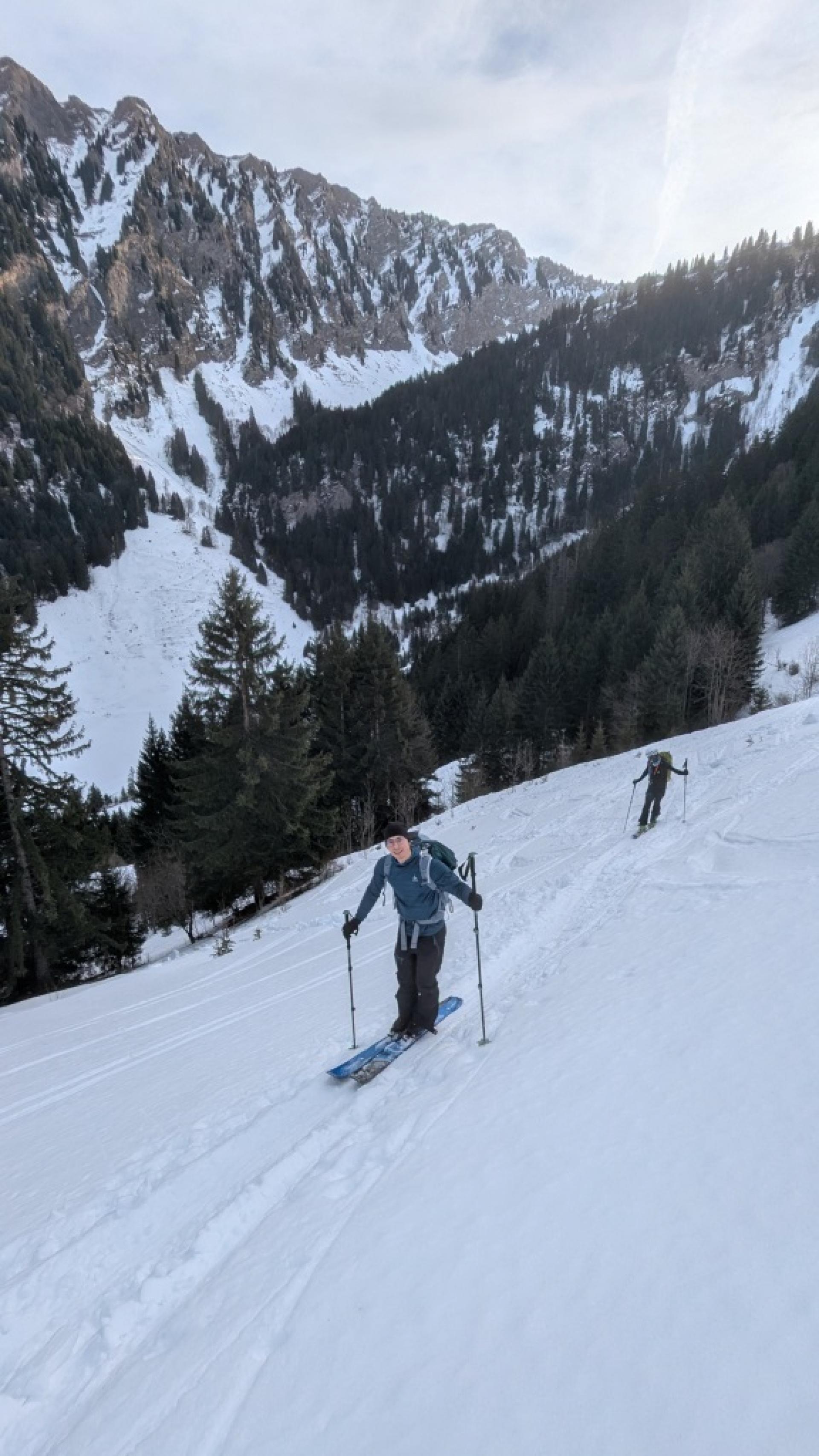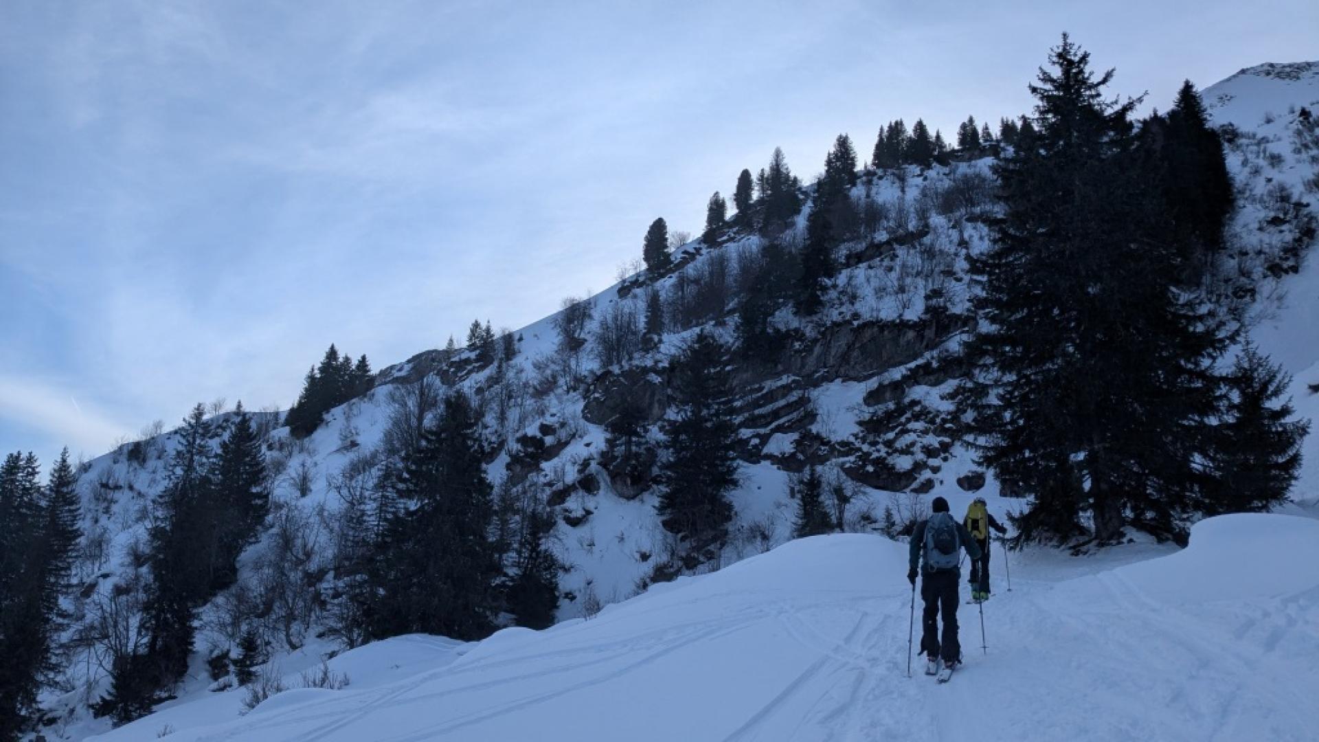 Le Tarent (2548m)Après une bonne nuit réparatrice (pour moi en tout cas!) et un bon petit déj à l’hôtel de la gare de Montbovon, on récupère Kilian qui arrive en train, sur le quai de la gare en face de l’hôtel à 8h20 pétantes (vive la ponctualité suisse!). Direction L’Etivaz pour faire découvrir aux « p’tits jeunes » le Tarent (malgré leur appréhension face au BRA à 3- et les derniers 100 m qui restent en rouge sur skitourenguru). Démarrage vers 9h, on longe la route jusqu’au petit barrage puis c’est parti pour l’atelier apprentissage des conversions en neige un peu dure et gelée dans la grande pente sous le Lévanchy. Kilian s’en sort bien mais y laisse quelques forces et quelques zipettes. C’est plus cool après le petit raidillon dans les vernes. On prend un petit rythme de croisière jusqu’à la traversée qui nous amène à la combe finale du Tarent. La neige est pas mal travaillée et soufflée par endroit. La trace est pas mal gelée donc faut faire gaffe à pas glisser. Pas besoin de mettre les couteaux non plus mais ça impressionne un peu Kilian qui avance doucement dans certaines traversées en neige dures. Arrivant à 2100 m, il décide de s’arrêter là, plus trop de jus pour poursuivre. Alexis propose de rester avec lui pendant que je vais vite faire le sommet. C’est donc parti pour les 400 m derniers mètres en mode rapide. Je rattrape quelques groupes et termine la montée ski sur le sac pour la petite pente sommitale et l’arête. Une dizaine de personnes au sommet qui pique nique en prenant le soleil. Je ne traîne pas et attaque dès le haut la descente ski au pied (aucun intérêt, c’est tout du dérapage sur la crête dans une neige dégueulasse pleine de caillasse). Le haut de la combe est en vieille poudreuse déjà très tracée. 200 m plus bas, c’est très travaillée voire croûtée donc pas évident à trouver la bonne orientation pour avoir de la bonne neige mais j’arrive à y prendre plaisir. Je retrouve Alexis et Kilian qui finissent de manger. Les champs entre 2000 m et 1700 m offrent une belle petite poudreuse encore agréable à skier. Par contre, en dessous, c’est déjà en train de regeler et ça devient croûté et difficilement skiable. Mes deux compères préfèrent faire le détour par la route pour éviter la partie dégueulasse dans les vernes. Je les attend en dessous puis retour au parking par le chemin encore bien enneigé.