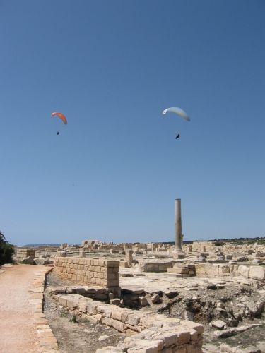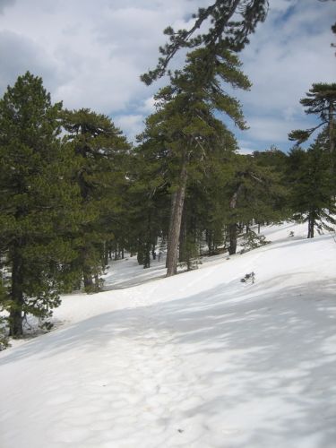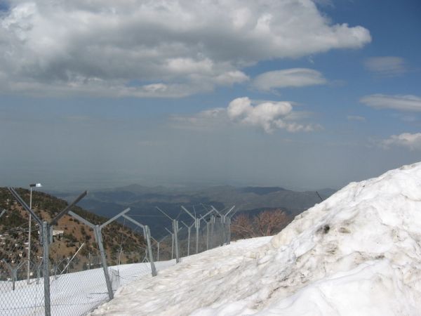 70 km nous separent de ce sommet et de la ville résidente Larnaca. On loue une voiture, on apprend a rouler à gauche dans les ronds-points, et on s\'arrete en passant visiter le site d\'Aphrodyte, et comtempler les ailes au dessus de la mer. On prend la direction de la montagne du troodos, croisant des villages accrochés aux rochers, pour atteindre un col enneigé qui sera notre point de départ de la randonnée pour le mont olympe. Croisant névés, sapins et pins noirs géants, on arrive sur un premier sommet ou l\'on découvre une remontée mécanique facon chypriote. Découvrant alors une piste de 300m, on se lance dans une glissade sans fin. Finalement, le vrai sommet a 1955m se trouve quelques centaines de metre plus loin, facilement accessible, et malheureusement occupé par une base militaire...Pour se consoler on prend alors un café chypriote. Le sommet passé et la fin de journée approchant, nous filons a la capitale Nicosie pour y franchir, passeport a la main, le mur qui separent la grèce chypriote de la republique turque. Le dernier combat remonte au 27 novembre 2008 et cela se ressent encore très fort...